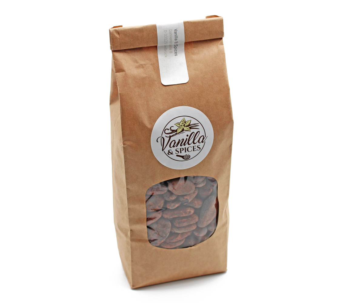 Rohe Kakaobohnen sind wie Mandeln mit der dünnen umhüllenden Schale essbar und haben einen intensiven zartbitter schokoladigen Geschmack.